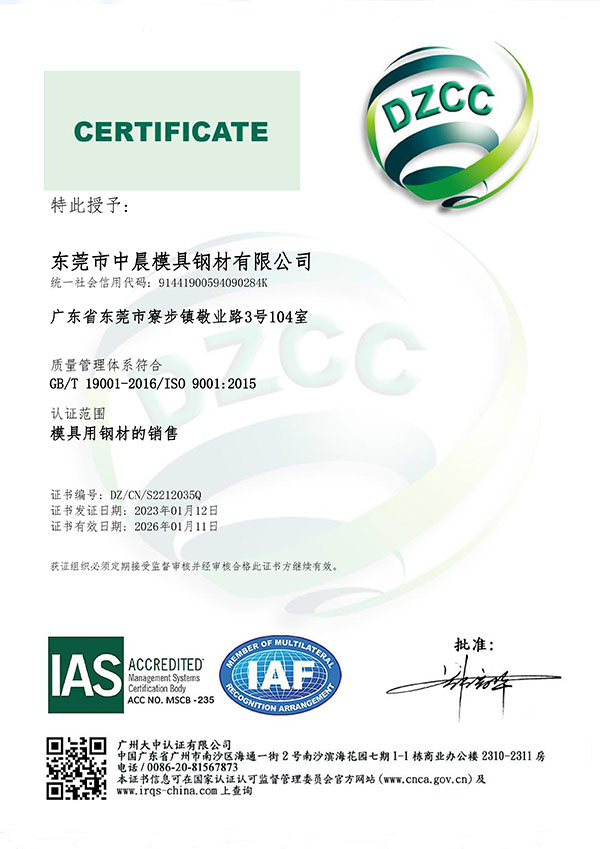 東莞市中晨模具鋼材有限公司-QMS-IAS-二階段